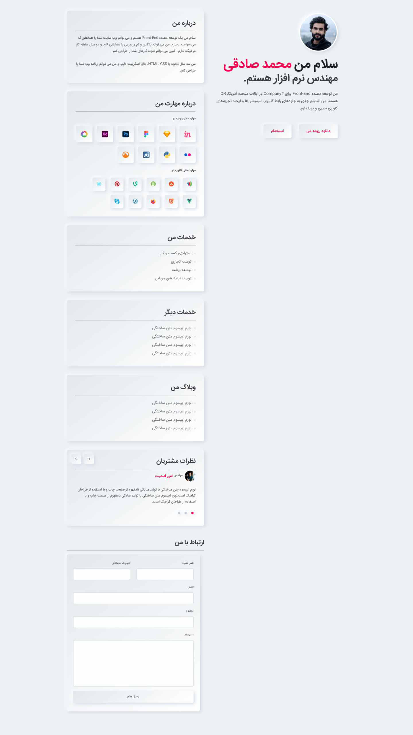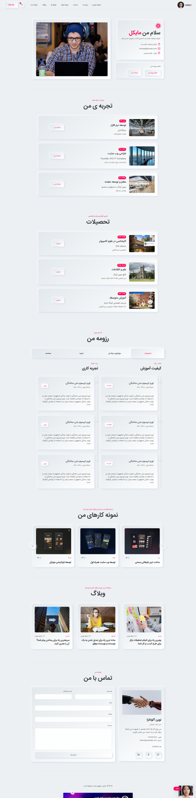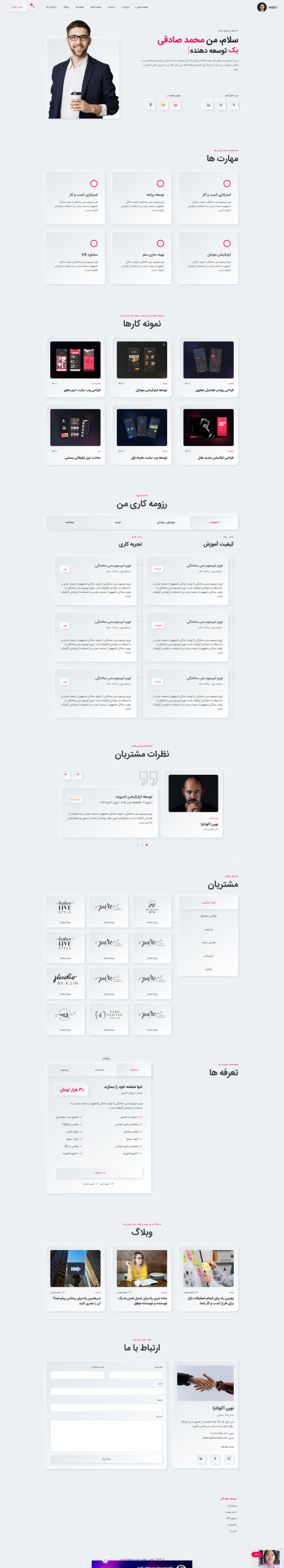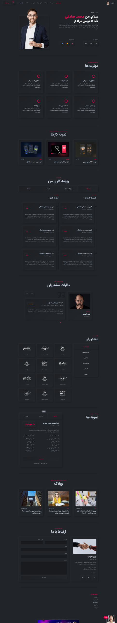 این یک وب سایت مدرن و مینیمال با تمام ویژگی های کامل و لازم برای راه اندازی یک سایت شخصی و ارائه رزومه و نمونه کار شماست. سبک، زیبا، شفاف و سریع برای نمایش مهارت های شما طراحی شده است.